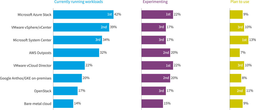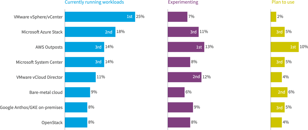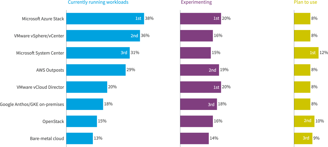 Azure Stack 还继续在企业中处于领先地位(42% 的企业目前正在运行工作负载)。VMware vSphere/vCenter位居第二,占39%。