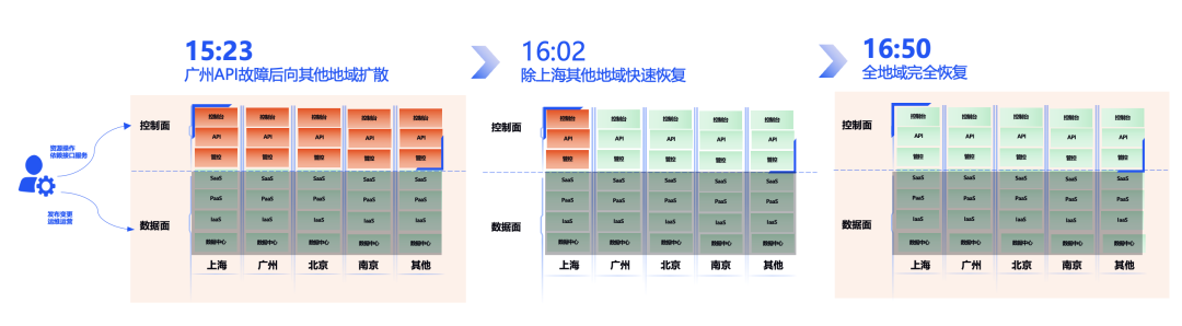 数据面与控制面:数据面承载客户业务,控制面负责操作云产品。本次故障主要影响了控制面。