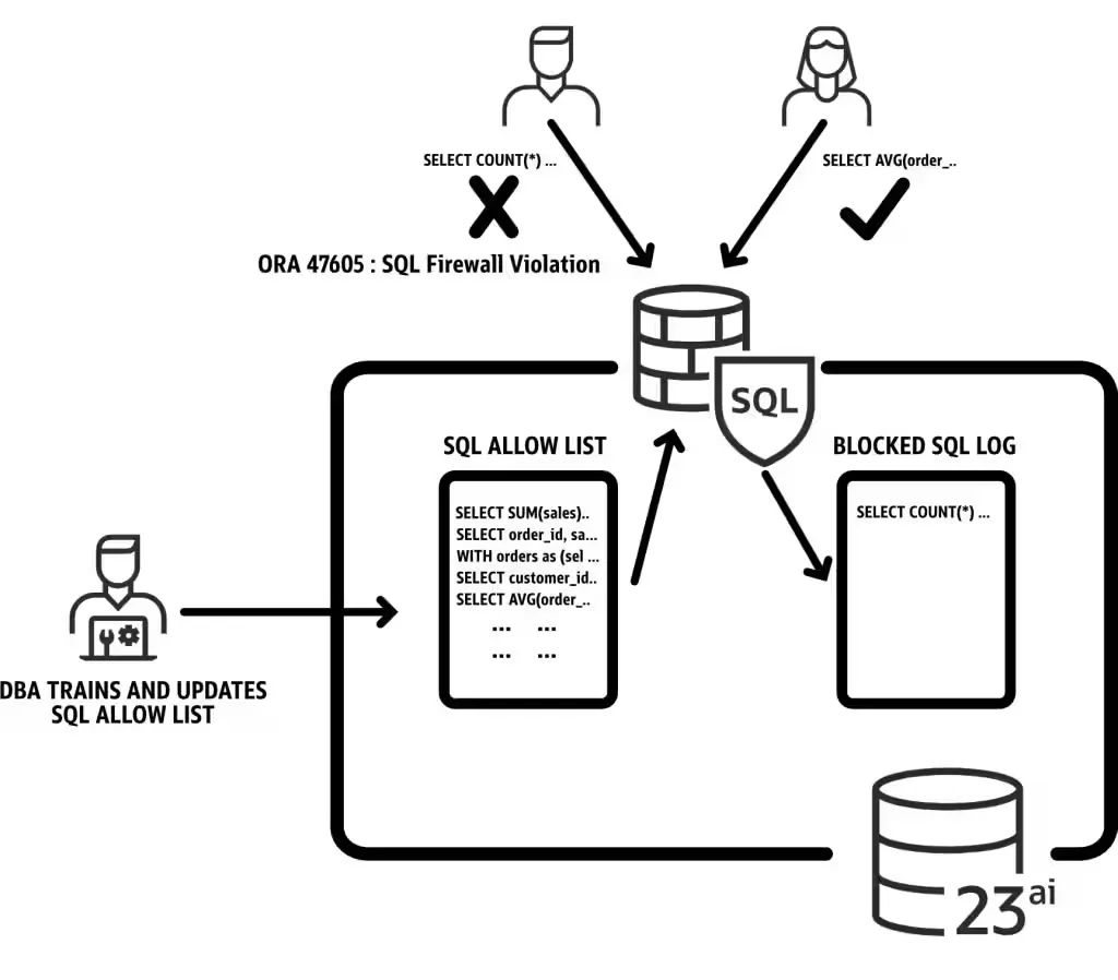 组织面临的挑战之一是恶意行为者不断试图窃取数据或破坏其日常活动。在 Oracle Database 23ai 中,为了防止未经授权的 SQL 执行,无论是通过 SQL 注入攻击还是由未经授权的员工执行,我们引入了 SQL 防火墙。SQL 防火墙允许您根据允许执行的 SQL 来训练数据库。然后,可以使用SQL的“允许列表”来记录未经授权的SQL或将其执行记录在博客中。可以添加其他条件以允许 IP 范围或授权呼叫程序的例外情况。SQL 防火墙的强大之处在于它是 Oracle 数据库的一部分,因此,它对 SQL 的执行施加的开销非常小。设置和训练 SQL 防火墙非常简单,可以通过 GUI 或通过对存储过程的几次简单调用来完成。