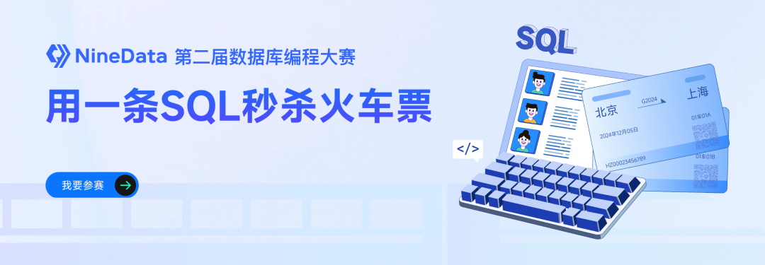 2024 年 12 月 5 日,由 NineData 和云数据库技术社区主办,华为云、Doris 等协办单位共同举办的 2024 第二届数据库编程大赛启动。比赛要求选手仅用一条 SQL 实现 “秒杀” 100 万张火车票。历经 2 周的赛程。大赛组委会依据评测规则,最终确定8强选手排名。2024 数据库编程大赛总结