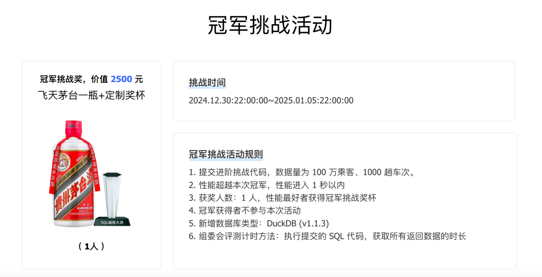 特别设立冠军挑战奖,完成挑战的选手将授予【终极 SQL 编程大师】的荣誉称号,另外性能第一名的选手的奖品为价值 2500 元的飞天茅台一瓶。此次活动于 2025 年 1 月 5 日 22:00 圆满落幕。